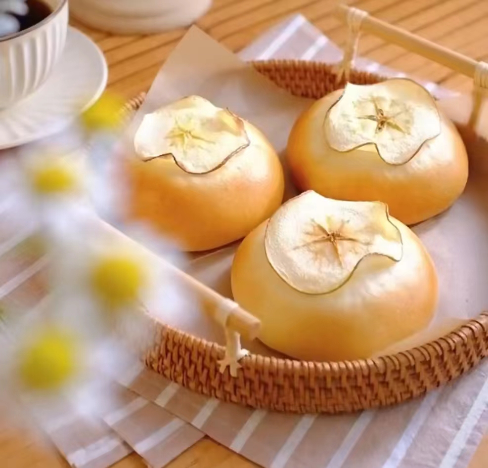 想讓麵包帶上一點美好的祝願,所以選擇蘋果來做,焦糖蘋果餡是利用肉桂捲餡料,放到麵包上,讓麵包的口感更上一層。蘋果意籲『希望大家都能平平安安、得償所願』