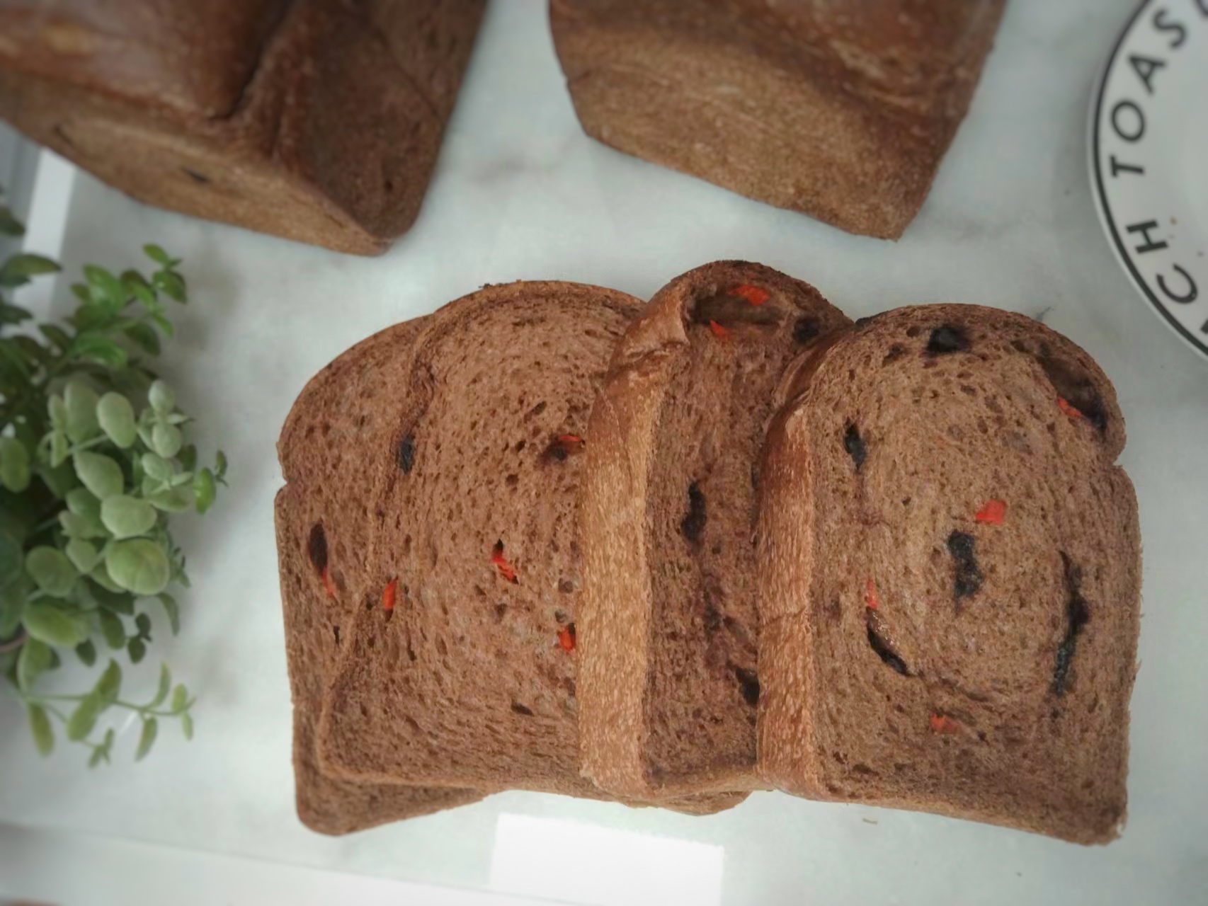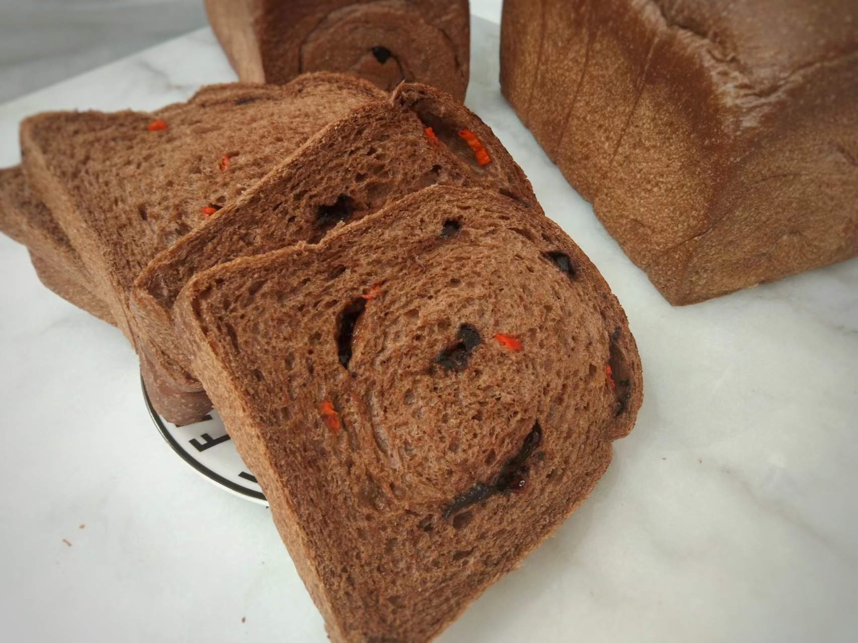 紅辣椒與巧克力的顏色鮮豔對比,讓我想起了相貌美麗而性格倔強的吉卜賽姑娘—煙廠女工『性感的卡門』,吐司口感上有些微的辣感被巧克力的甜溫柔地化解,紅辣椒不搶味而有特色。