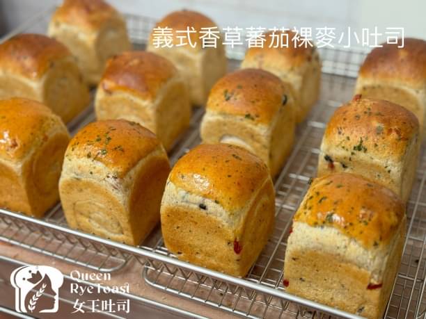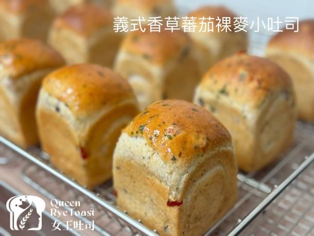 風味鹹吐司,番茄乾甜甜的,利用油浸香草蕃茄乾,讓番茄乾產生不一樣的風味,搭配黑橄欖碎,出爐後再表面抹上巴西里風味橄欖油。