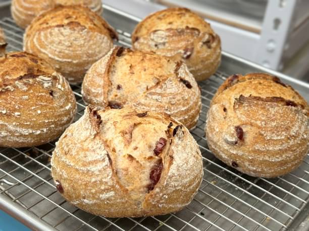 酥脆與焦化的外皮,剛吃到嘴巴時會覺得有點硬感,裡面濕軟有嚼勁的口感,越吃越覺得麵包體的香氣非常迷人,加上小小的亞麻籽、酸甜的蔓越莓,整體味道很有層次感。
