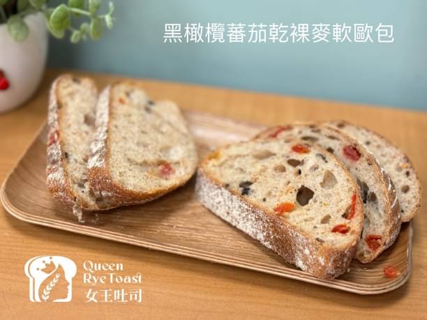番茄乾加上馬告的檸檬胡椒香氣、切小碎的黑橄欖味道很柔和,番茄乾甜甜酸酸的味道在歐包上很配,我個人滿喜歡這個口味的